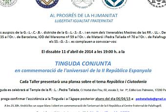 El próximo sábado 11 de abril las RR.·.LL.·. Pedra Tallada nº70, Iod del Maresme nº59 y Descartes nº35 organizan una Tenida Conjunta en ocasión del aniversario de la Segunda República Española.