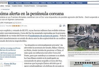 Hemos hablado de Corea en nuestra clase de Historia este curso, especialmente en el tema del imperialismo vimos cómo acabó cayendo en manos japonesas. Tras la derrota del Japón en la II Guerra Mundial, la península de Corea se dividió en dos estados separados por el paralelo 38, surgieendo así una de las denominadas "fronteras de la guerra fría". Pues bien, en la próxima clase nos centraremos en el estudio de la Guerra de Corea que tuvo lugar entre 1950 y 1953. No estaría mal que, como aperitivo, os animaséis a leer noticias actuales como ésta (están en toda la prensa, en algunos casos con alusiones a los antecedentes históricos) que demuestran que, a pesar de la paz que se firmó en 1953, el conflicto sigue latente.
