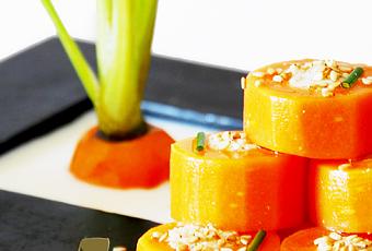 Pelamos la zanahoria y la torneamos a fin de que nos quedecilíndrica y todos los aros sean más o menos iguales. Cortamos trozos de uncentímetro aproximadamente. Vaciamos con un abocardador. Escaldamos en aguahirviendo. Retiramos y ponemos a hervir en otra agua en la que habremosintroducido una rama de hinojo fresco y unas semillas de comino –un par o tres,debe destacar el hinojo por encima del comino- y una punta de jengibre fresco,hervimos al dente. Retiramos e introducimos en agua con hielo. Reservamos ysecamos. Con el queso de cabra, hacemos una pasta, añadimos una cucharada desemillas de sésamo, una pizca de comino molido y el ciboulette picado muy fino. Amasamos esa mezcla con un tenedor,vamos ligando añadiendo aceite de argán. Rellenamos los aros de zanahoria conesa masa.