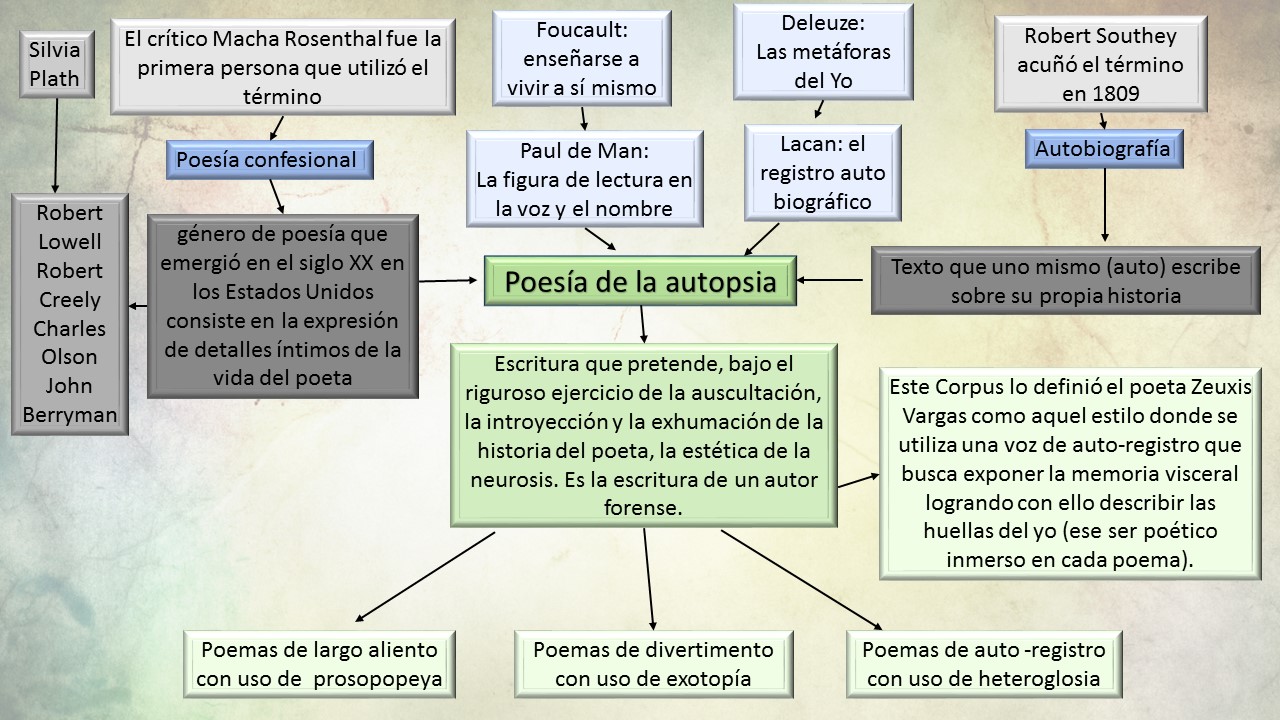 La poesía de la autopsia es el concepto personal que utilizo para poder definir toda mi obra poética. La poesía de la autopsia hay que entenderla desde el significado que doy a el termino autopsia. AUTOPSIA o vivisección: Escritura que pretende, bajo el riguroso ejercicio de la auscultación, la introyección y la exhumación de la historia del poeta, la estética de la neurosis. Es la escritura de un autor tenaz, forense. Escritura que disecciona al poeta hasta mostrar sus vísceras. Escritura de la autopsia. Este Corpus está definido por una voz confesional que parte de la memoria visceral, memoria que genera su catarsis por medio de las entrañas; por medio del reconocimiento de ciertos signos visuales y conceptuales que resaltan la realidad de un conglomerado de experiencias espeluznantes y bellas que ulteriormente posibilitan la identificación única de un ser. El esquema de la autopsia es el siguiente: