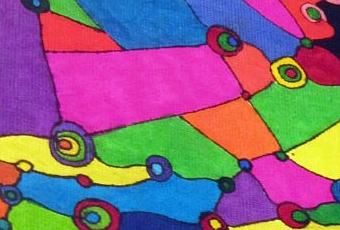 Empiezo con algo delicado, trazos y esferas multicolores pero, después, empiezo a llenar el fondo de color. Primero, tímidamente (sólo una zona, pretendo) y, después, en plan descarado. Los laterales de mis manos, se llenan de rastros de tinta. Azul, violeta, rosa, verde manzana, negro, amarillo, naranja…