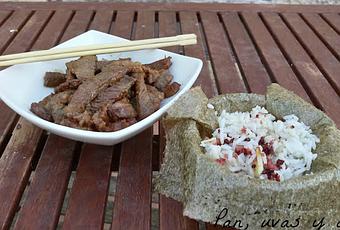 Filete de ternera: 400 gramos.Arroz Basmati: 200 gramos.Bacon ahumado: 100 gramos.Salsa de soja: 2 cucharadas.Azúcar moreno: una cucharadita.Naranja: una.Jengibre fresco: un trozo de 1,5 centímetros de ancho.Ajo: 3 dientes.Aceite de oliva virgen extra.Vinagre de arroz: una cucharadita.Agua: 300 mililitros.