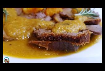 3.-A continuación, retiramos la fuente del horno. Cortamos la carne en rodajas finas. Retiramos las hiervas aromáticas, los clavos y las bayas de enebro. El resto lo trituramos todo con el brazo de cocina, dejando solo unas rodajas de naranjas para decorar. Servimos la carne con la salsa de naranjas.