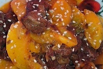 Desde que entre en el grupo, supe mis ingredientes, lo que no tenia tan claro es que iba hacer con ellos. Así que me puse a pensar y recordé una conversión que tuve con mi costi diciendome que había probado una vez una ternera con melocotón y quería probarla de nuevo.