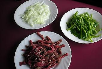 Se cortan los filetes en tiras finas y la cebolla y los pimientos en juliana.