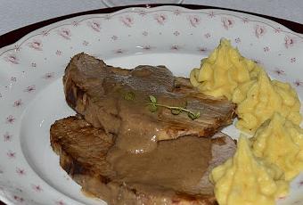 Pasado este tiempo retiramos la carne de la olla y pasamos la salsa por la batidora. Añadimos la nata y rectificamos el sazonamiento si fuera necesario. La carne la cortamos en lonchas finas para servirla y la bañamos con la salsa de castañas. La podemos servir con un puré de papas parmentier.