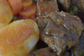 En un mortero echar un puñado de bayas de enebro (usé una docena) y machacarlas. Tostarlas en una sartén ligeramente (así se realza su aroma y sabor). En un cuenco, echar los trozos de ternera, el enebro molido y tostado, unas hojas de tomillo fresco y una cucharada pequeña de pimienta verde fresca (la encuentro en cualquier gran superficie). Agregar vino tinto (he usado un Ribera de Duero) hasta cubrir la carne, removiendo bien todo el conjunto. Dejar marinar en el frigorífico durante cuatro o cinco horas (se puede dejar de un día para otro). Picar en trozos pequeños un pimiento rojo, una cebolla y cuatro o cinco dientes de ajo. En una cacerola echar un buen chorreón de aceite de oliva virgen extra. Escurrir la carne y salar al gusto, agregándola a la cacerola una vez que el aceite esté caliente, sellarla durante unos minutos. Cuando se vaya evaporando los jugos de la carne, añadir la cebolla, los ajos y el pimiento, removiendo todo el conjunto. Una vez que la cebolla esté transparente, agregar todo el líquido de la marinada junto con dos vasos de agua (caliente a ser posible), si es necesario añadir un poco más de vino y llevar a ebullición. Mientras, pelar dos tomates maduros y cortar en trozos pequeños agregándolos a la cazuela junto con un poco más de tomillo fresco, una cucharada de orégano, dos hojas de laurel y una cucharada de pimentón dulce. Rectificar de sal y dejar cocinar a fuego lento una hora y media aproximadamente. Pasado éste tiempo sacar la carne y el caldo pasarlo por la minipimer. Volver a incorporar la carne a la cacerola y pasar la salsa por un colador (así quedará sin grumos y muy fina).