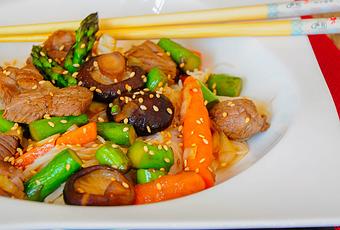 Servir una porción de fideos de arroz con una ración de ternera y verduras y espolvorear un poco del sésamo tostado por encima.