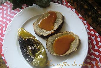 Servimos la carne, en esta ocasión con los pimientos verdes fritos, y regamos la salsa de pimientos ahumados por encima.