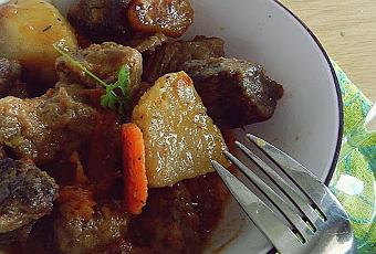 Cuando el vino haya reducido añadimos el vaso de caldo y el vaso de agua (o todo caldo). Removemos bien y dejamos cocinar hasta que el caldo reduzca y la carne se quede jugosita unas dos horas. De vez en cuando ir removiendo.