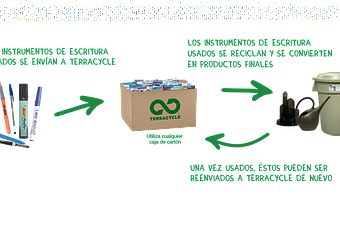 Durante la primavera pasada, Terracycle aterriza en España de la mano de BIC, el fabricante mundial de bolígrafos e inician un programa de recogida de bolis en los lugares donde éstos más se utilizan: colegios, universidades y empresas. Con la vuelta al cole, BIC y TerraCycle invitan a las escuelas a unirse a sus esfuerzos para reciclar más instrumentos de escritura y ayudar a asociaciones como Fundación Exit y Fundación + árboles.