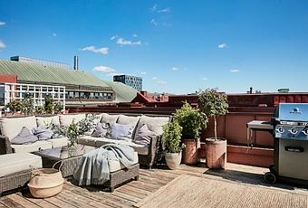 Sea como sea, los nórdicos disfrutan muchísimo los pocos días de verano que tienen, e invierten tanto o más que nosotros en mobiliario de terraza y accesorios, en las fotos podéis ver que no les falta de nada, barbacoa, zona de sofás, plantas, alfombras, etc. etc. por cierto, que me pregunto, cómo habrán subido todo eso por el hueco de la escalera :).