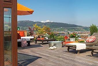 hortensias, pendientes de la reina, tuyas y varios arces japoneses, colocados sobre la barandilla, para dar intimidad sin perder las magníficas vistas a la ciudad de Oviedo, en uno de esos escasos y sorprendentes días despejados que sólo se ven en el Norte.