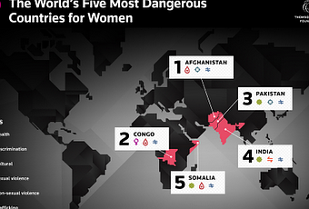 En esta clasificación, los cinco países de mayor peligro para la mujer son: Afganistán, República Democrática del Congo, Pakistán, India y Somalia. Otros países como Guatemala, México también ocupan un lugar elevado en este terrorífico ranking.
