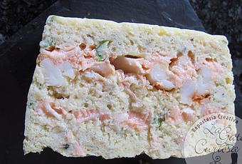 Cortamos el salmón sin piel ni espinas en tiras gruesas. Forramos un molde de plumcake con papel de horno (para que el papel no se mueva lo mejor es engrasar primero el molde), ponemos en el fondo una parte del puré de pescado, sobre esa capa pondremos la mitad del salmón en tiras y sobre el salmón la mitad de las gambas salteadas, repetimos la operación otra vez, dejando al final una capa del puré de pescado, es decir 3 capas de puré de pescado y dos de salmón y gambas.