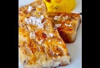 10. Cortamos raciones del grosor de un dedo y las vamos friendo por todos sus lados con gotas de aceite de oliva virgen extra que iremos añadiendo según vamos friendo por los distintos lados de nuestros "lingotes" de manitas. Servimos inmediatamente echando unas gotas de aceite de oliva virgen extra por encima y una escamas de sal.