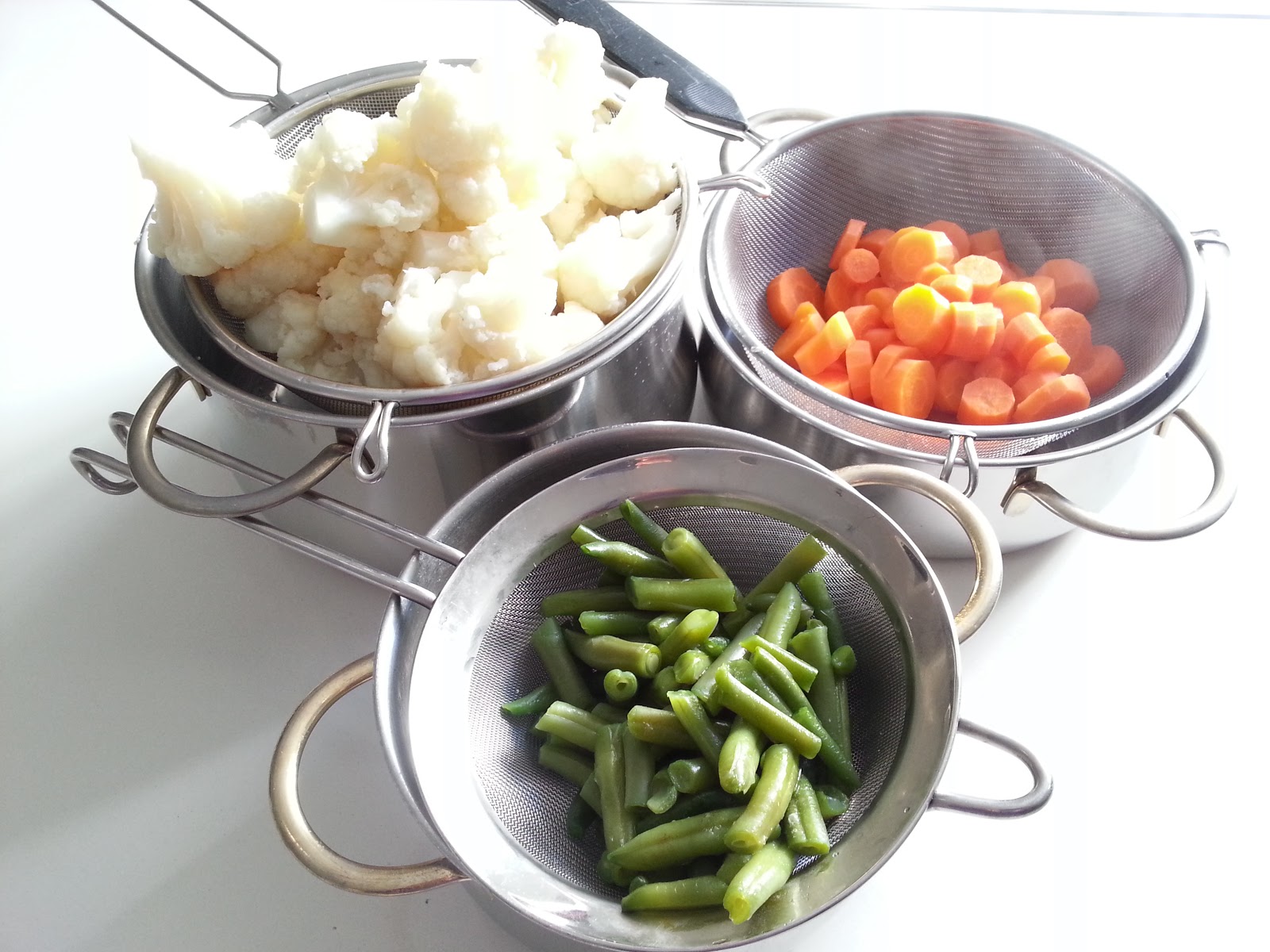 1/2 kilo de zanahoriasuna coliflor pequeña (una vez limpia han sido unos 600 gr)250 gr de judías verdes (yo utilizaría 500 gr) 3 huevossalPimienta500 gr de Salsa de tomate1/2 cucharita (de las de café) de orégano1/2 cucharita (de las de café) de tomillo1/2 cucharita (de las de café) albahacaUnas gotas de tabasco