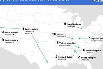 La Odyssey y la Ridgeline de Honda, que cuentan con la minivan y camioneta más fabricadas en Estados Unidos, quedaron en el puesto 5 y 6, mientras que el Toyota Camry y el Jeep Gladiator saltaron 19 puestos cada uno para aterrizar en el 7 y 8. El Lexus TX hace una entrada memorable al índice, aterrizando en el puesto 10. La lista completa está disponible en Cars.com/AMI .