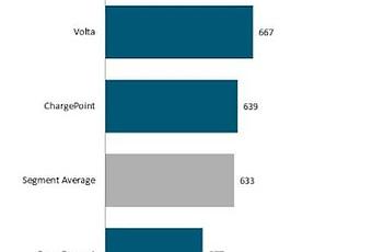 Tesla Destination ocupa el primer lugar entre las estaciones de carga de Nivel 2 con una puntuación de 680. Volta (667) ocupa el segundo lugar y ChargePoint (639) el tercero.