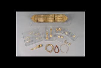 ComentariosEste conjunto está compuesto por 43 piezas: 1 diadema, 1 collar,1 brazalete, 2 colgantes, 2 anillos, 5 pares de zarcillos, 2 arracadas, 2 cilindros y varias cuentas de cornalina. Probablemente corresponden a distintos momentos cronológicos, según diferentes criterios tipológicos y formales. Se suele atribuir estas piezas al ajuar de una mujer.