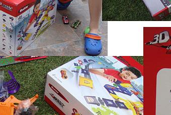 Tratándose de un juguete, mis hijos como os podéis imaginar estaban entusiasmados, deseando abrir la caja que no sabían muy bien qué era. Así que cuando vieron el dibujo de una pista de carreras los ojos les empezaron a hacer chiribitas. Nervios hasta que abrieron todas las bolsas y esparcieron todo el contenido.