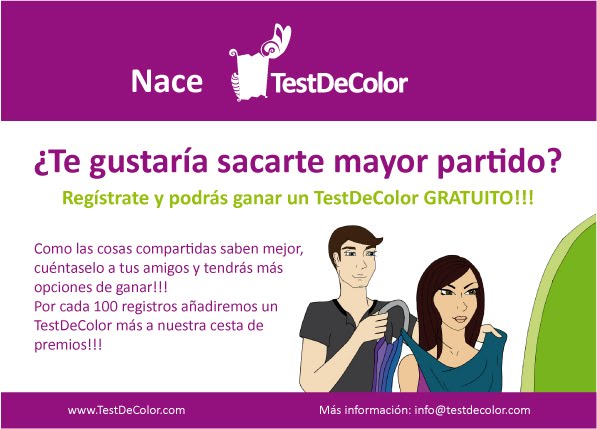 En TestDeColor quieren haceros partícipes de su proyecto, y han desarrollado varias acciones con motivo de su inauguración:- Concurso para registros particulares:Con motivo de su inauguración virtual, TestDeColor lanza un concurso, para todas aquellas personas que se registren en su site como particulares. El premio consiste en un servicio de análisis de color*, y por cada 100 usuarios que se registren agregarán un TestDeColor en su cesta de premios. Cuantos más usuarios registrados haya al finalizar el concurso, más posibilidades de ganar.- Concurso entre bloggers:En TestDeColor, quieren agradecer la labor realizada por los bloggers involucrándoles en su lanzamiento. Para ello, han desarrollado un concurso entre blogs. En su formulario de registro TestDeColor pondrá una casilla para indicar a través de quién o dónde los conocieron, los 3 blogs que consigan un mayor número de registros ganarán de forma directa 500 €** en productos y servicios TestDeColor.- Posibilidad de regalar TestDeColor con suscripciones:TestDeColor pone a disposición de las principales cabeceras, la posibilidad de ofrecer el servicio de TestDeColor como regalo para un número determinado de suscriptores.Tanto los registros de particulares, como los registros de profesionales son gratuitos.