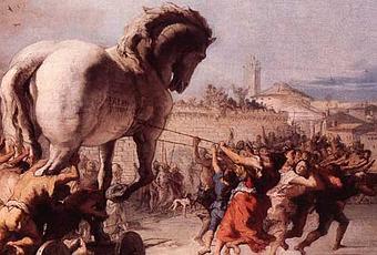 Las semillas de la guerra se sembraron durante la boda de Peleo y Tetis, a la que acudieron todos los dioses trayendo magníficos regalos. Todos, excepto una diosa que no fue invitada. Su nombre era Eris, la diosa de la discordia. Llena de rencor por no haber sido invitada, lanzó una manzana de oro entre los invitados con la inscripción «para la más bella». Hera, Afrodita y Atenea asumieron que la manzana era suya. Finalmente fue el príncipe regente de Troya, Paris, el que tuvo que juzgar y eligió a Afrodita, porque ella le había prometido a la mujer más bella del mundo a cambio de su elección. Esta mujer era Helena, pero ella ya estaba casada con Menelao, rey de Esparta. En cuanto pudo, Paris la secuestró y se la llevó a su hogar, en Troya, desencadenando la guerra con los griegos aliados de Menelao.