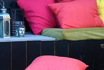 Últimamente no dejamos de observar tonos flúor por todas partes, amarillos chillones y fucsias subidos de tono se dejan ver (sobre todo en cuanto a moda se refiere), sin embargo, en el hogar, estos colores "subiditos de tono" los dejamos para algunos complementos y textiles.Esta terraza, es un claro ejemplo de ello. Un espacio oscuro que a simple vista no nos dice nada, después de llenarlo de cojines coloridos, observamos la llegada de un soplo de aire fresco y luminoso... La idea es mezclar un par de colores y jugar con sus texturas y tonalidades. Nada mas allá de la composición!!!!¡Os deseamos un feliz fin de semana!