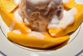 7. Pelamos y cortamos el mango a trozos. Para servir, ponemos un montoncito de arroz en el centro de cada plato y lo rodeamos de cortadas de mango. Luego echamos la salsa por encima, servimos el postre inmediatamente... ¡y a disfrutar!