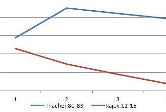 Thatcher no consiguió recortar el gasto público ni tampoco el déficit en sus primeros cuatro años de mandato. Rajoy pretende reducir el gasto público 6 puntos de PIB desde 2011 a 2015 y situarlo 7 puntos por debajo del que dejó Thatcher en 1983.