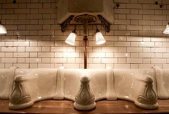 Nunca hubiera imaginado una transición tan original como la de este local.Unos baños en el centro de Londres que se quedaron en desuso se han transformado en una cafetería. Lo curioso de la transformación es que se han mantenido los urinarios existentes como ornamento de la cafetería dejando un local con mucho carácter y originalidad.