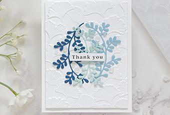 Seguramente os habréis dado cuenta de que las carpetas de embossing están muy de moda últimamente. Hay muchísimas ideas y formas diferentes de usarlos en internet, y por una buena razón, ¡son un producto increíble y versátil! Para mi tarjeta de hoy he usado la carpeta de embossing "Gingko Leaves" para crear un precioso fondo blanco sobre blanco. Después solo he tenido que añadir unas cuantas ramitas del troquel "Fiddly Leaf" y un sentimiento para terminar mi tarjeta.