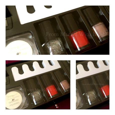 Y por último pero no menos importante, sino más bien todo lo contrario, en el tercer piso encontramos una selección de: sacapuntas, lacas de uñas, separadedillos, máscara, eyeliner y glitter. No me digais que nunca se os ha olvidado el sacapuntas en casa! O que se os ha saltado la laca de una uña! Pues eso que es muy completo.Hay una cosa que no me resulta atractiva y es por deformación profesional y son sus pinceles. Los considero de emergencia, por si no te apetece llevarte tu manta y te hacen las veces, pero debes darte buena maña. El problema de ellos no está en la calidad del pelo, sino en el corte que les han dado a los mismos. Y bien saben todos los dioses que yo hasta hace poco odiaba las esponjitas aplicadoras, pero son útiles. Que levante la mano, la que no ha usado una en su vida... nadie en la sala, verdad? Si ya lo decía yo...