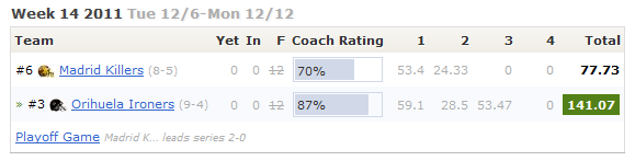 Orihuela Ironers, muy contundente con Eli Manning (36,47), un inconmensurable Pierre-Paul (17) y la suma de un cuerpo de receptores quienes, no siendo de los destacados de la liga, están mostrando su tremenda fiabilidad: Marshall - MIA (12,7), Smith - BAL (17,4), Pitta - BAL (11,9). Por su parte, Madrid Killers, ha defendido su posición con honor. Durante la regular season empezó sorprendentemente fuerte más si tenemos en cuenta la lesión de su Qb#1, Peyton Manning. Pero entre los Fitzpatrick, Welker, Jenkins o Hester, ha sorteado las dificultades con soltura. Particularmente negativo para sus posibilidades fue la lesión de Matt Forte. Mejor suerte el próximo año!.