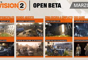 La beta abierta contiene 3 misiones principales, 5 secundarias, la zona este de Washington D.C. (incluyendo la Zona Oscura) y un pequeño adelanto del ‘endgame’ con una misión de invasión y tres especializaciones; así como el modo PvP Escaramuza, para 4VS4 jugadores.