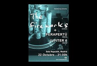 The Fireworks llegan desde Londres, será una ocasión especial para tenerles dado que presentarán su E.P. más reciente, publicado por el sello americano Shelflife records y por ende su mejor show.Perapertú por su parte llegan desde Madrid con la colección esencial de temas en directo que nos gustan, se espera mucho de su show.Jupiter 6 es un power trío con más de una década como formación, son una banda a tener en cuenta en directo.