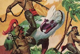 "The Last Moa on Earth" (Action Comics #425, 1973)Hay muchos cómics de ambientación antediluviana en los que aparecen aves extintas, como los moas, el dodo o los epiornítidos de Madagascar, y ello no supone ningún ejemplo de anticipación. Por eso, hay que ser algo cautos a la hora de hablar de dinosaurios emplumados en viñetas antes de los hallazgos de fósiles de terópodos plumíferos a finales de los 90 en China.