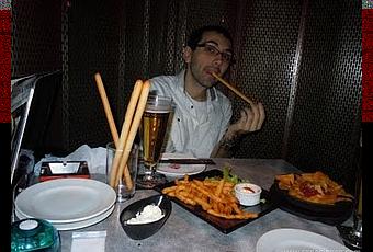 Desde dentro de mi prision no se veia mucho y no pude hacer muchas fotos la verdad, pero la ambientación estaba muy bien. La comida como podeis comprobar tambien estaba muuuuuy buena. Esos Nachos, esos calamares o esa especie de Pizza / panini estaban increibles.. y habia muchisimas mas cosas con buena pinta que queria probar.. pero eso otro dia será. Como bien recordaba, en mitad de la cena se apagaron de pronto todas las luces y comenzó el espectaculo. Presos, zombies y demas monstruos del averno se escaparon de sus jaulas y vinieron a asustarnos (Kaori se asustaba como una niña pequeña XD estos japoneses no dejan de sosprenderme) los grupos de japonesas inocentes de nuestros lados tampoco podian parar de gritar de terror cada segundo.. Despues de un rato de sustos fueron viniendo las policias (todo tias con minifaldas casi imposibles y mas wenorras que lo que podria entrar en vuestra imaginacion) y fueron disparando, matando y cazando a los "monstruos del averno". fue un espectaculo divertido de casi 10 minutos (aunque Kaori no lo disfrutó mucho no se porque.. XD) Cuando terminó, por los altavoces dijeron que para las personas que peor lo habian pasado recibirian un regalo de la casa... que considerados!!