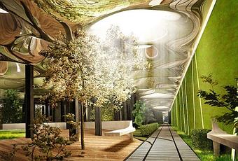 Perspectiva del parque subterráneoEl proyecto consiste en un avanzado sistema que cuenta, en primer lugar, con unos colectores de luz solar que serán instalados en los techos de los edificios ubicados a los alrededores del parque. Estos colectores dispondrán de dispositivos para girar y seguir en todo momento al sol pudiendo así reflejar la luz hacia los concentradores