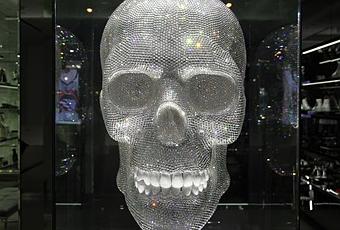 The skulls, tacks and glitter, which we are using since a few seasons, and that has been copied to infinity, are the work of Philipp Plein. Also when you enter in the flagship the first thing you see is a giant skull with thousands of Swarovski crystals and the large chandelier with skulls decorating the entry. Amazing.