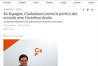 En Francia, Le Monde titula: “En España, Ciudadanos abre la puerta a acuerdos con la extrema derecha”. También la prensa francesa ve claro que los pactos con la extrema derecha en España dejan en una situación a Ciudadanos que difícilmente puede explicar a sus votantes. Quizá desde la distancia tengan una mejor perspectiva, y esto les da cierta capacidad de análisis que parece que falta en la prensa de masas española. Según el rotativo, Ciudadanos ha logrado colocar como presidente de la Asamblea de Madrid a Juan Trinidad gracias a los votos de Vox y que el partido ultra logró un puesto en la mesa gracias a ese acuerdo. El artículo también explica los posibles acuerdos liberales llevados a cabo por los tres partidos de derecha en Murcia y Castilla y León y asegura que es una posición “difícil de defender” cuando este partido “pretendía encarnar la regeneración de las instituciones españolas”.