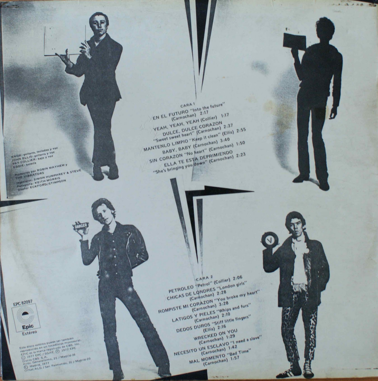 En el futuro (Into the Future....)Yeah Yeah YeahDulce, duce corazón (Sweet Sweet Heart)Mantenlo Limpio (Keep It Clean)Baby Baby(Sin corazón) No HeartElla te esta deprimiendo (She's Bringing You Down)Petrolio (Petrol)Chicas de londres (London Girls)Rompiste mi corazon (You Broke My Heart)Latigo y pieles (Whips and Furs)Dedos duros (Stiff Little Fingers)Wrecked on YouNecesito un esclavo (I Need a Slave)Mal mmento (Bad Time)Epic EPC 82097Publicado en españa en 1977