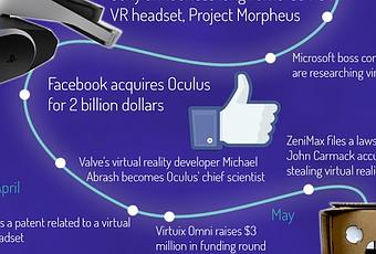Es el año 2015 y es el momento de echar un vistazo atrás en lo que sucedió en el mundo de la realidad virtual en 2014. En uno de sus artículos, nos muestra una infografía que refleja las noticias más destacadas sobre Realidad Virtual en 2014.