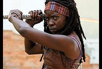 La primera imagen del personaje de Michonne, que aparecerá en la TERCERA TEMPORADA de The Walking Dead ya ha llegado. El papel de Michonne será interpretado por la actriz Danai Gurira, a la que hemos visto en películas como "The visitor" y en la serie "Treme".El personaje de Michonne apareció al finalizar la segunda temporada. Sólo se veía un encapuchado que portaba una espada y que llevaba a dos zombies atados con cadenas.