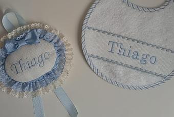 Thiago en breve estará aquí y podrá hacerse fotitos con su babero personalizado y podrá salir a pasear con la medalla en su carrito.