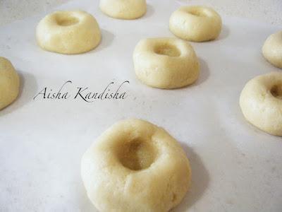 - Formamos bolitas de masa, las disponemos en una bandeja de horno forrada con papel vegetal y presionamos en el centro con el pulgar para formar el agujero central.