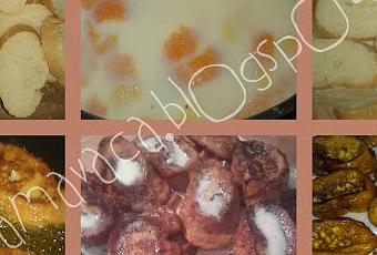 - En un cazo, ponemos la leche, el azúcar, la canela en rama y las peladuras. Hay que intentar que las peladuras sean lo más finas posibles y no pillar la parte blanca de detrás, ya que podría darle un gusto amargo a la torrija. Calentamos a fuego lento... A mi me gusta tenerlo un ratillo, como 15-20 minutos para que coja bien el sabor de las cosas. Hay que ir removiendo de forma más o menos continua para que la leche no se nos pegue- Mientras, podemos cortar el pan en rebanadas de un dedo, dedo y medio de grosor ( se entiende un dedo a lo ancho, no a lo largo ) y lo colocamos en una fuente.