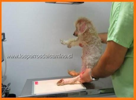 Al día siguiente, al levantarme voy a verla, se comió todo el alimento, la saco de la jaula para que haga sus necesidades, corre a buscar tierra, se pone en postura para defecar, está un rato, y viene hacia mi, es en ese momento que voy descubriendo sus tremendas heridas. Viene hacia mi, sin darse cuenta se le cae de su ano, una pelota de fecas, y cuando camina deja su estela de orina por donde pasa. Me llama la atención que cojea. La observo, casi me dió ataque, cojeaba con el muñón de la patita hacia atrás. Miro su cuerpo, está lleno de heridas profundas, como profundas serán las heridas de su alma. La tomo en brazos, es inmensa la humildad de sus ojos. La perrita aún está con su cuerpo con parasitos. Entonces me acuerdo de un médico veterinario que hace un tiempo me ofreció sus servicios, el quería ayudar a los perros del camino, además me queda cerca. La subo a la jaula y nos vamos a la clínica. A pedido de el, no pondré su nombre.