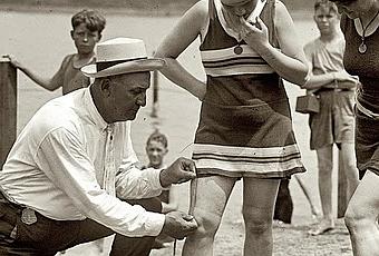 Ayer hablábamos del machismo de Berlusconi y del Frankfurter Allgemeine, hoy me he encontrado con esta "curiosa" foto, patética más bien. Está tomada el 30 de junio 1922 en Washington, el policía Bill Norton mide cuidadosamente la distancia desde las rodillas hasta el borde de un traje de baño. No debería ser más de seis pulgadas. Tales eran los tiempos y las medidas, ¿serán estos los deseados por algunos? Quizás.