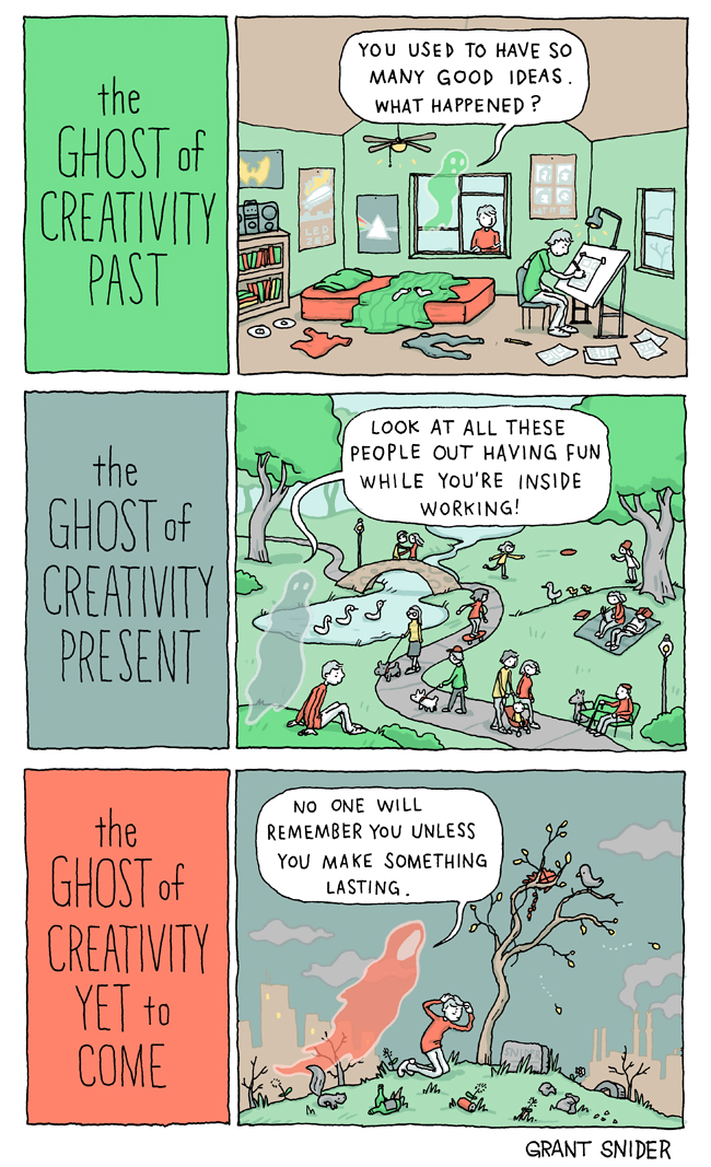 Y luego está Grant Snider que además de unir todo lo anterior, sabe dibujar. La lástima es que creo que no sabe español y no podrá leer este post.